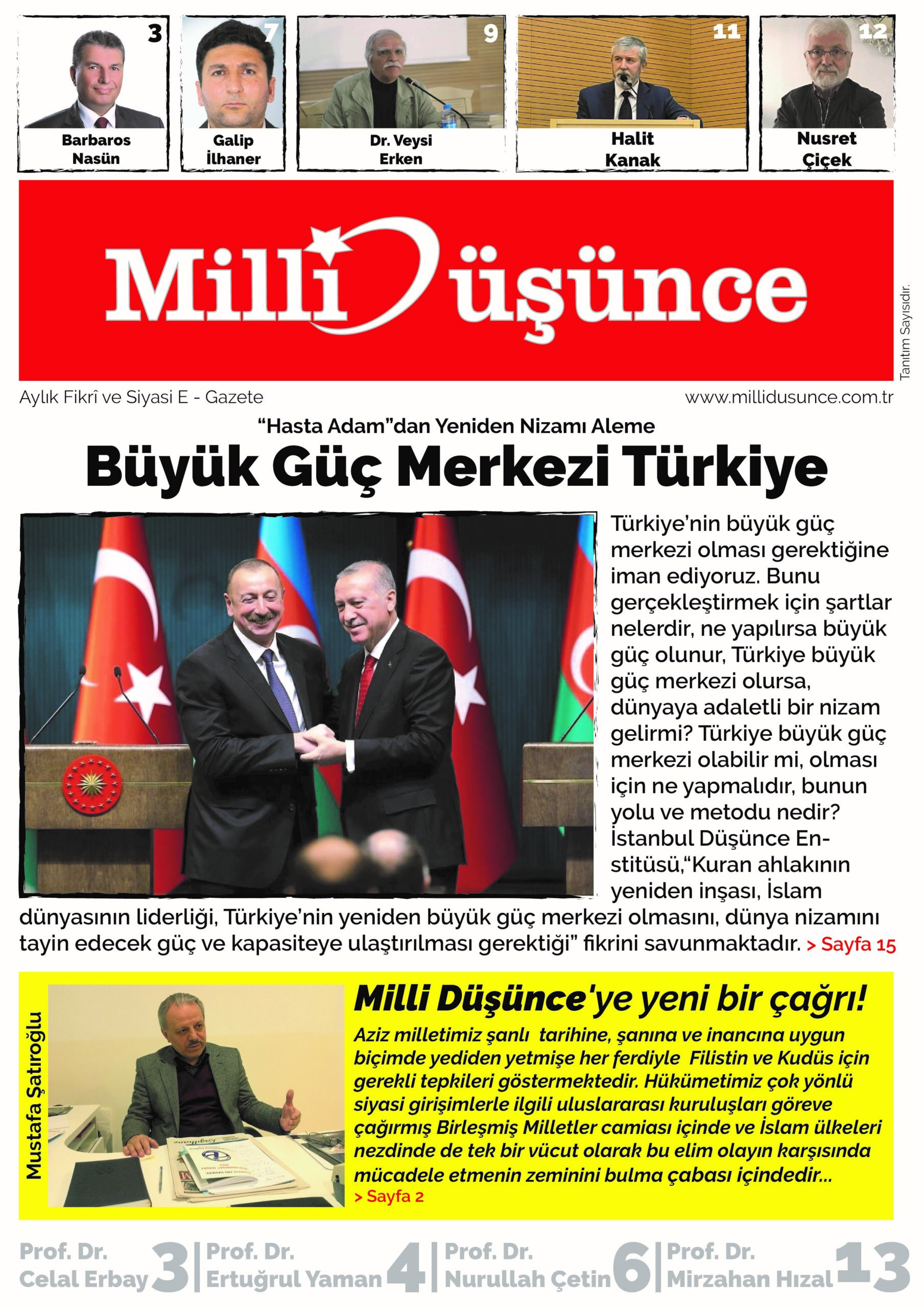 Mübarek Ramazan Bayramı’nın bu ilk gününde; sizlere bir hediye sunmak üzere Haziran ayından itibaren 15 günde bir yayınlanacak Milli Düşünce gazetemizin tanıtım sayısı ile huzurlarınızda olmaktan büyük bir memnuniyet duymaktayız. Bu aziz ve mübarek bayramın ruhunu ve neşesini idrak etmeyi bize çok gören İslam ve insan düşmanı siyonist İsrail barbarlığı, ilk kıblegahımız Mescid-i Aksa’yı ablukaya almış ve yüzlerce Filistinli kardeşimizi yaralayıp katlederek kutsal mabedimizin harem-i ismatine tecavüze yeltenmiş, tarumar etmeye kalkışmış bulunmaktadır..